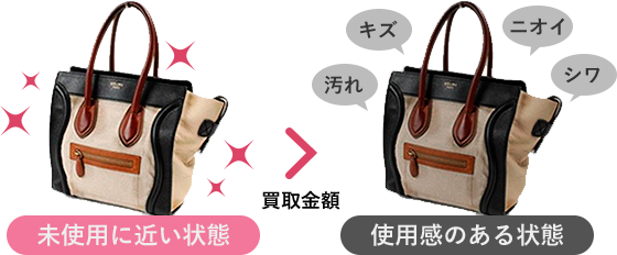 そのため、お買取の際、汚れ・キズ・においなどがあると、買取金額に大きく影響してきます。 ひとつ汚れがあるだけで、お買取金額が極端にお安くなってしまったり お買取できなくなるケースもございます・・・。