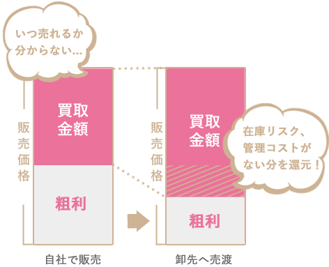 当店はお客様からお譲りいただいた商品を自社で販売せず、卸先へと売渡しています。